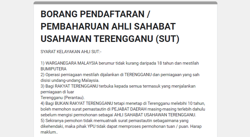 Bagi BUKAN RAKYAT NEGERI TERENGGANU tetapi menetap di Negeri Terengganu melebihi 10 tahun, boleh memohon SURAT BERMASTAUTIN di PEJABAT DAERAH masing-masing dahulu sebelum memohon keahlian Sahabat Usahawan Terengganu.